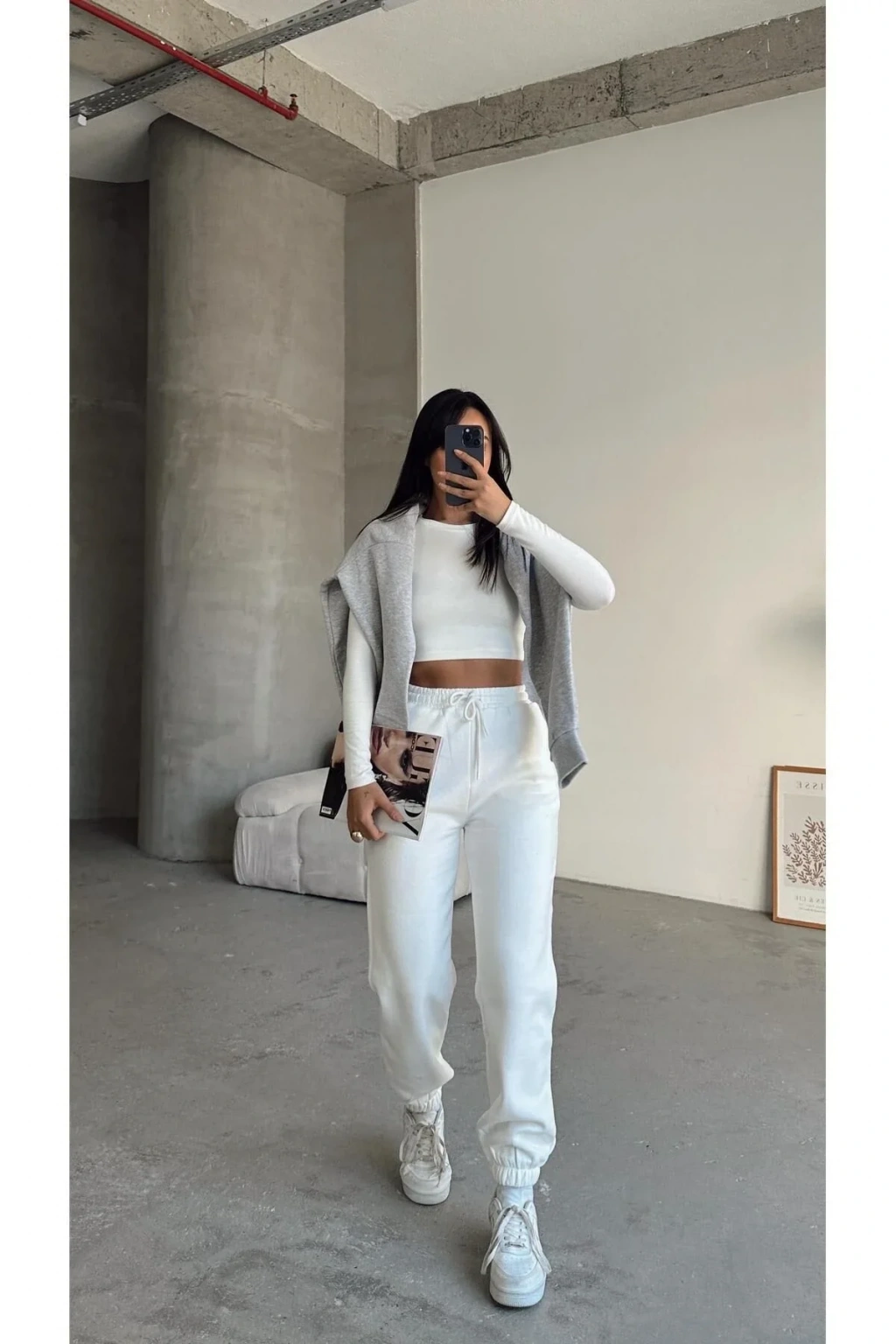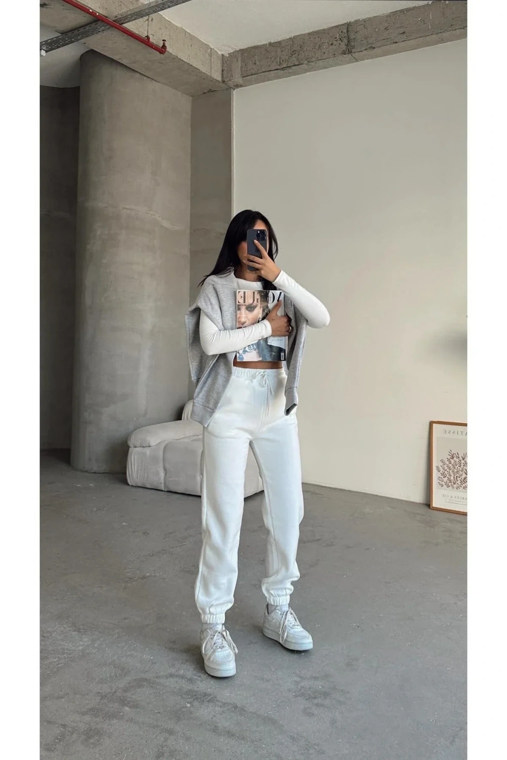 Ayrıca, şardonlu paça detayı sayesinde ayarlanabilir bir uzunluğa sahip olan eşofman altı, farklı bedenlere kolaylıkla uyum sağlar. Beyaz rengiyle her tarza ve kombinasyona uyum sağlayan bu eşofman altı, spor yaparken veya günlük hayatta stilinizi tamamlamanıza yardımcı olacaktır.