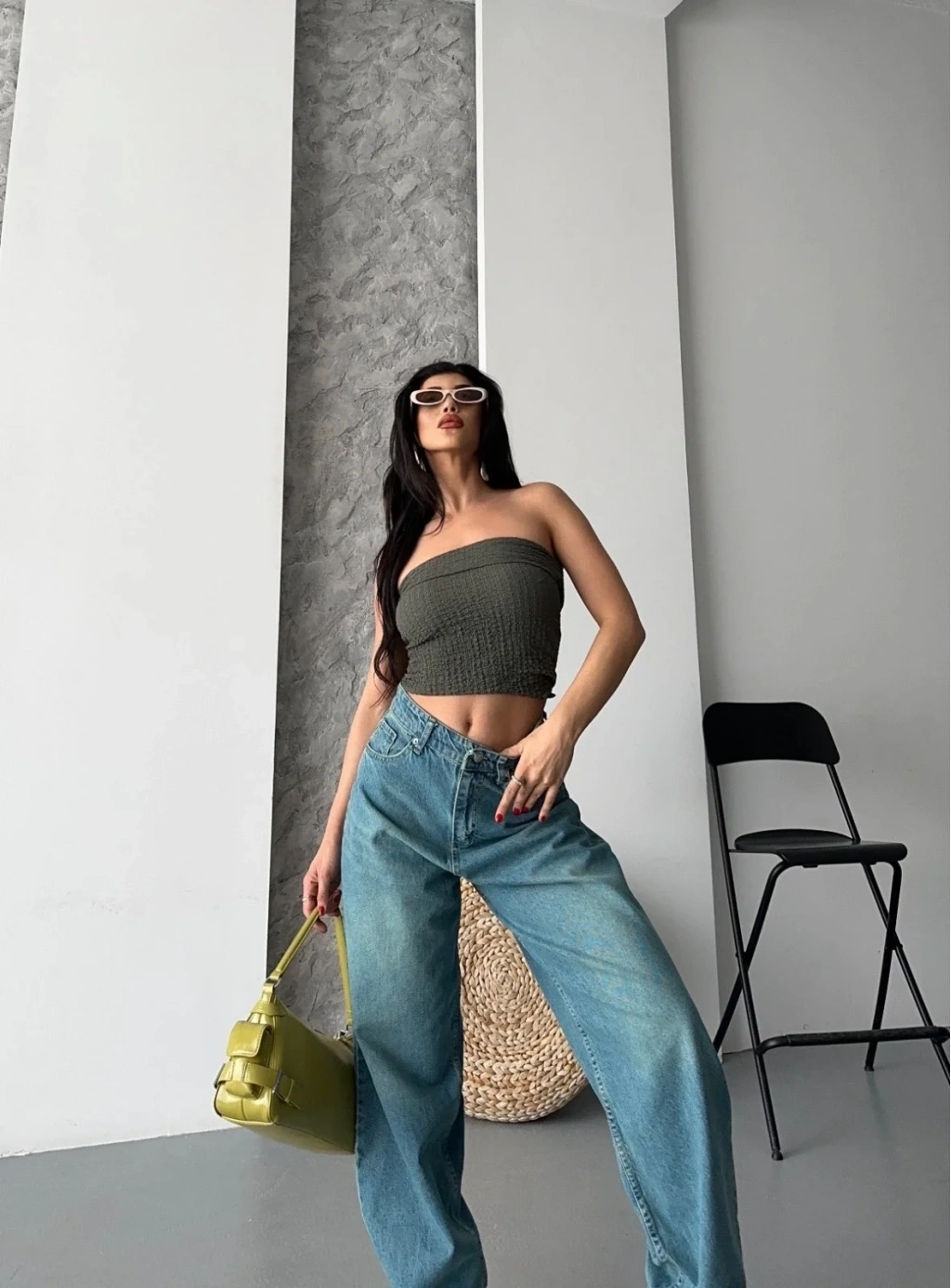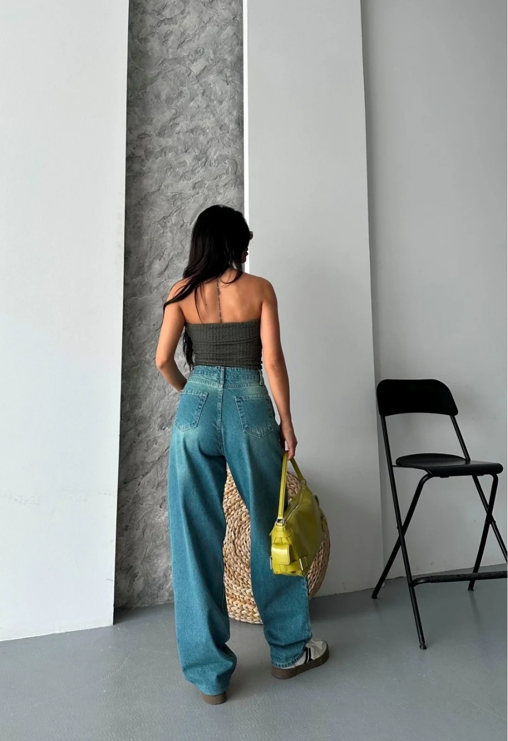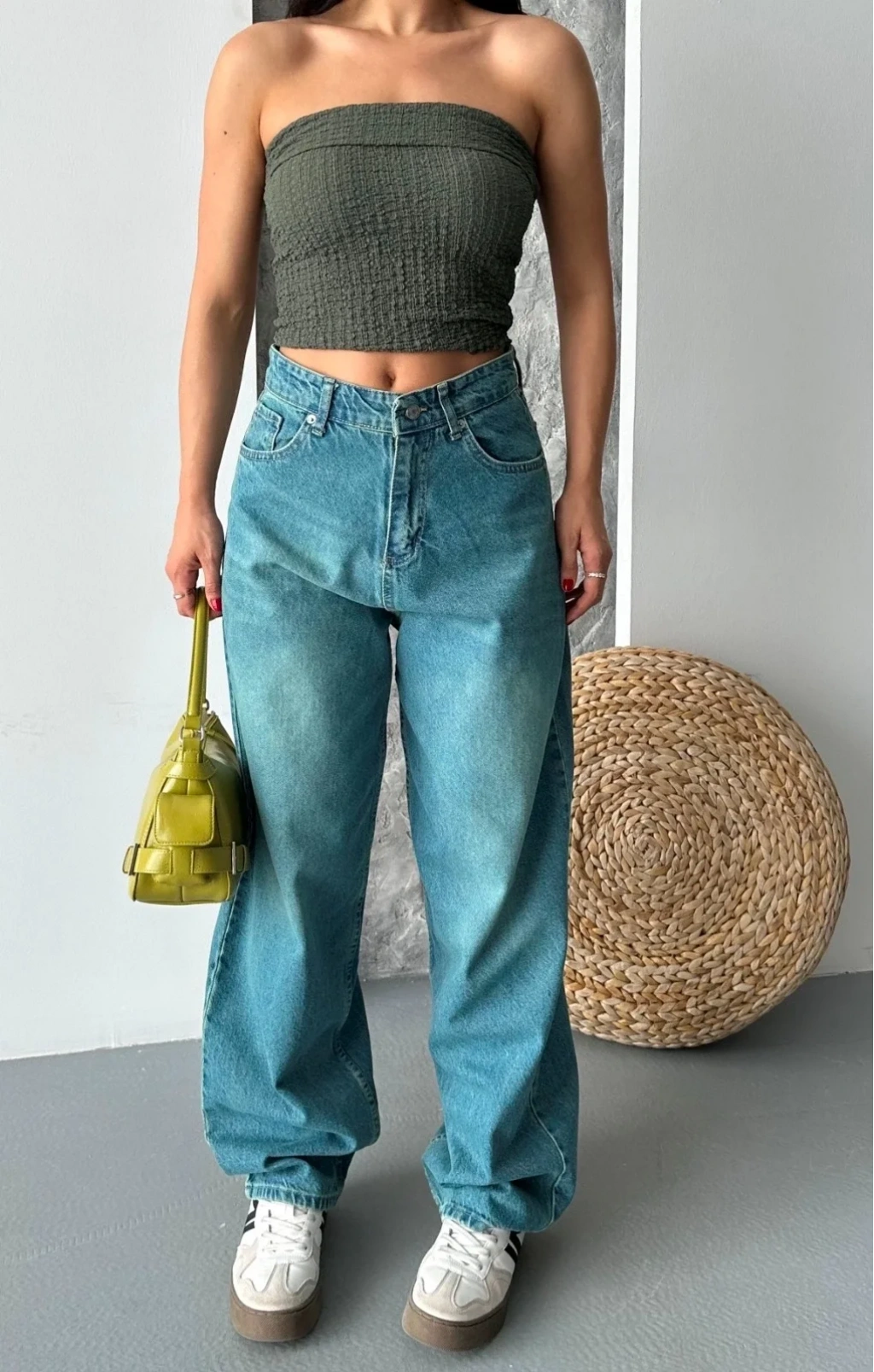 Kadınlar için şıklığı ve rahatlığı bir arada sunan Baggy taş enzim bıyık yıkama jeans pantolon yeşil tint d2007, gardırobunuzun vazgeçilmezi olmaya aday.