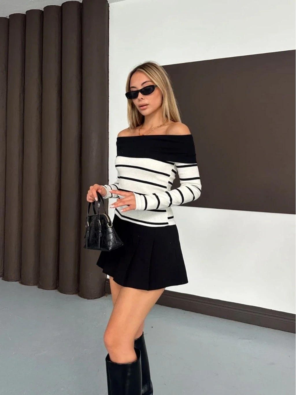 • Kaşkorse kesimi, vücudu saran ve şekillendiren bir görünüm sunuyor.