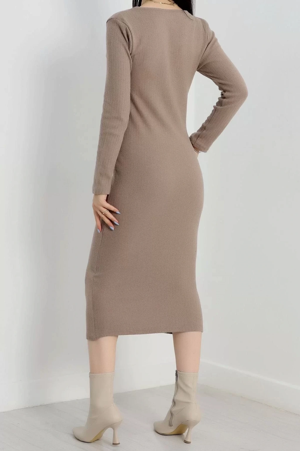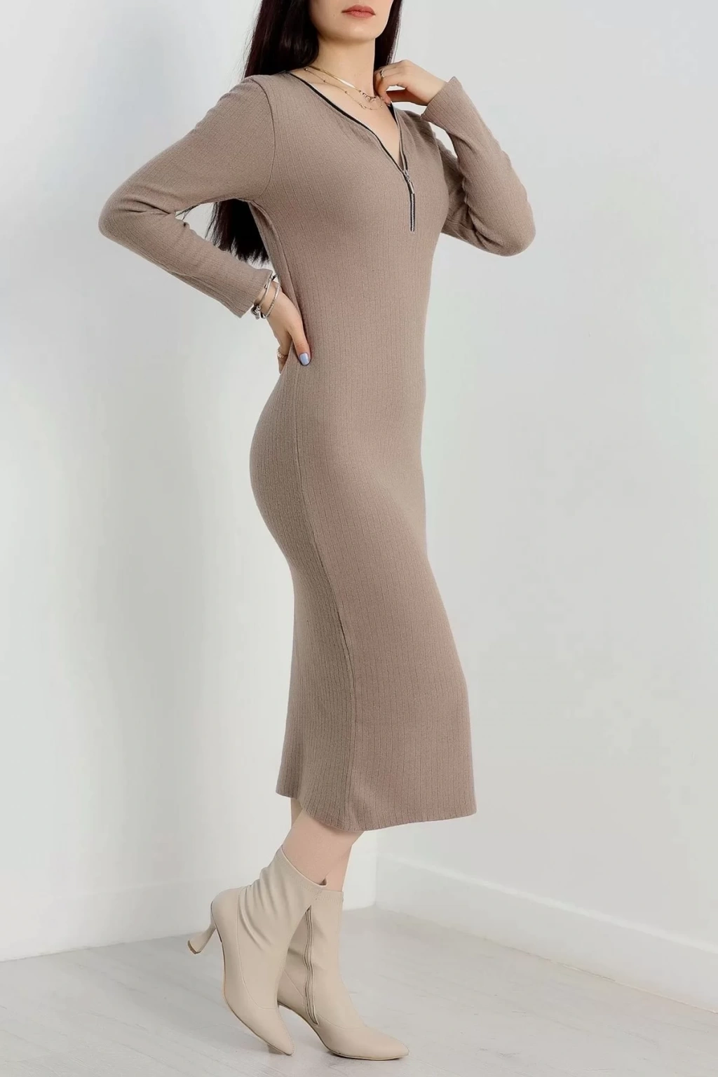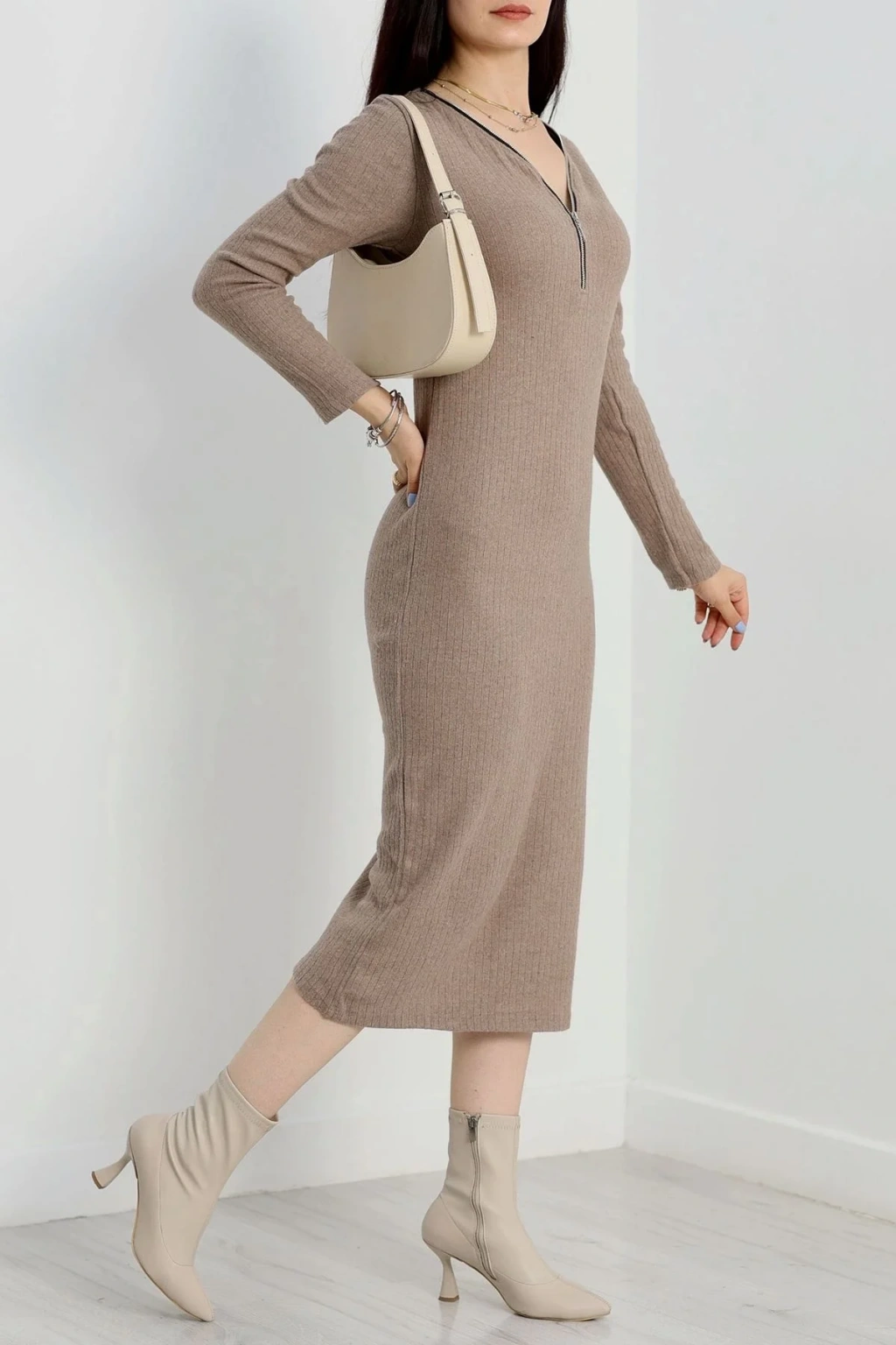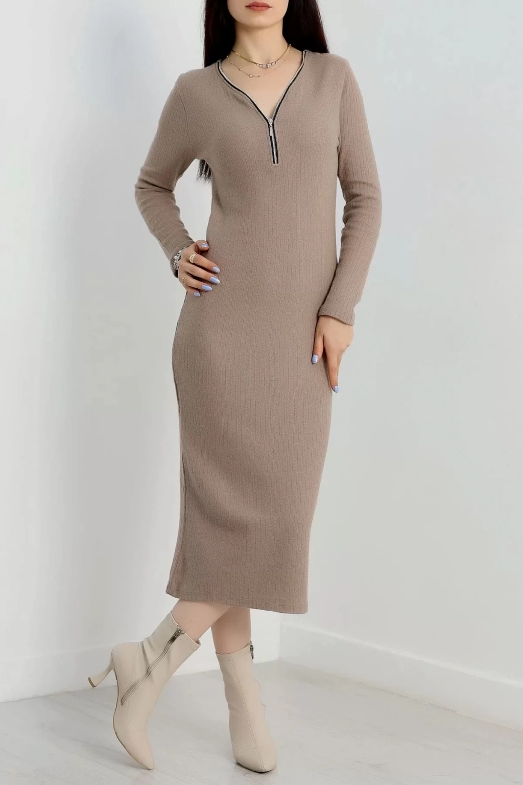 Şıklığı ve rahatlığı bir arada sunan bej renkli şardon kumaştan üretilmiş Fermuar Detaylı Fitilli Elbise, gardırobunuzun vazgeçilmezi olmaya aday.
