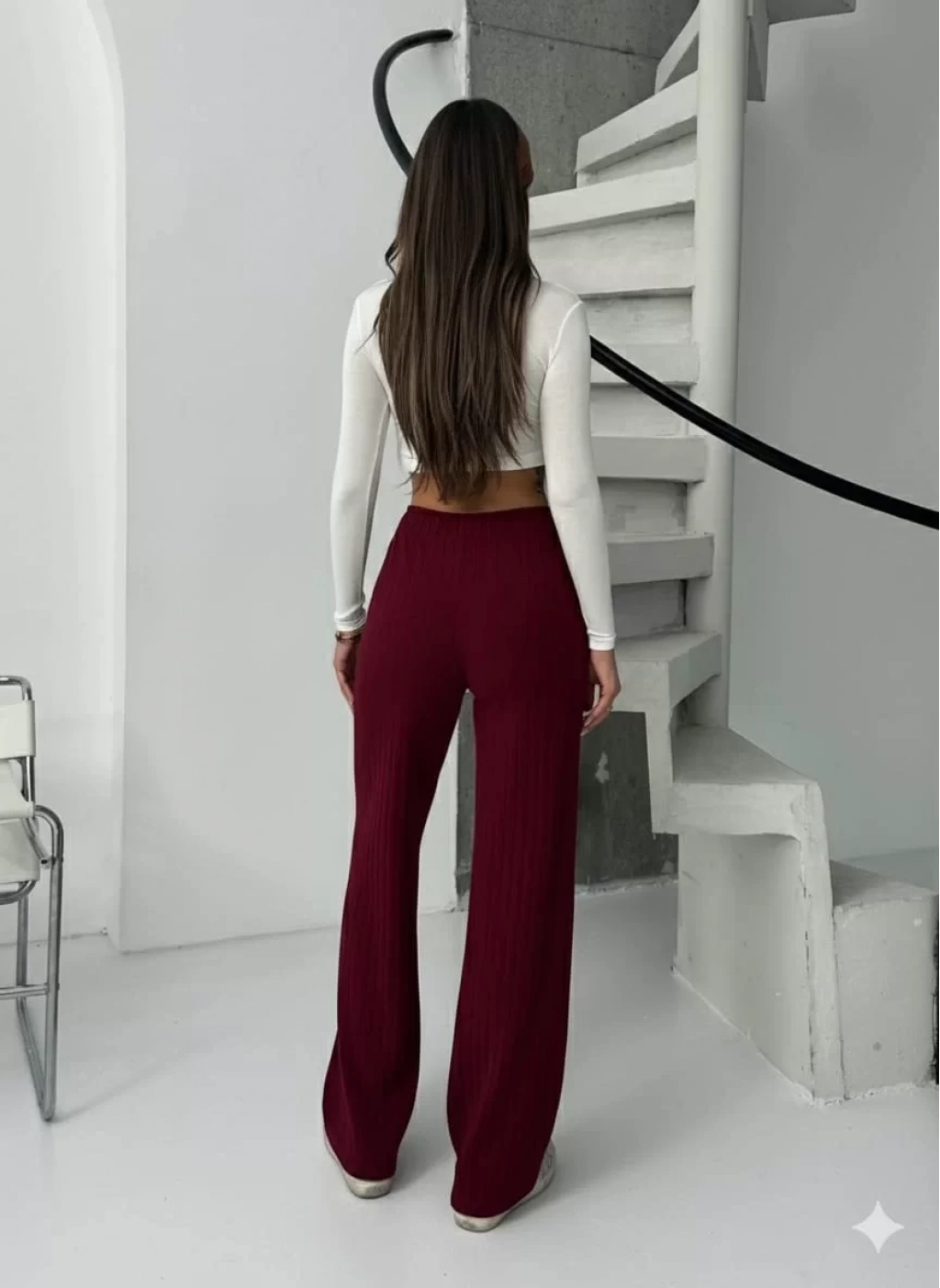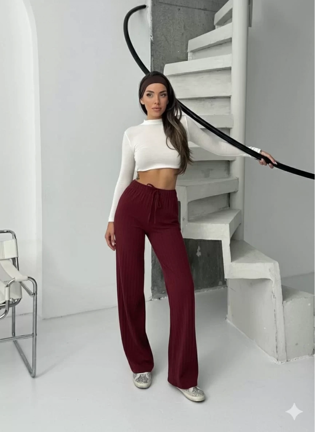 Fitilli şardonlu pantolon bordo renk seçeneği ile gardırobunuzda şıklığı ve rahatlığı bir arada bulabilirsiniz.