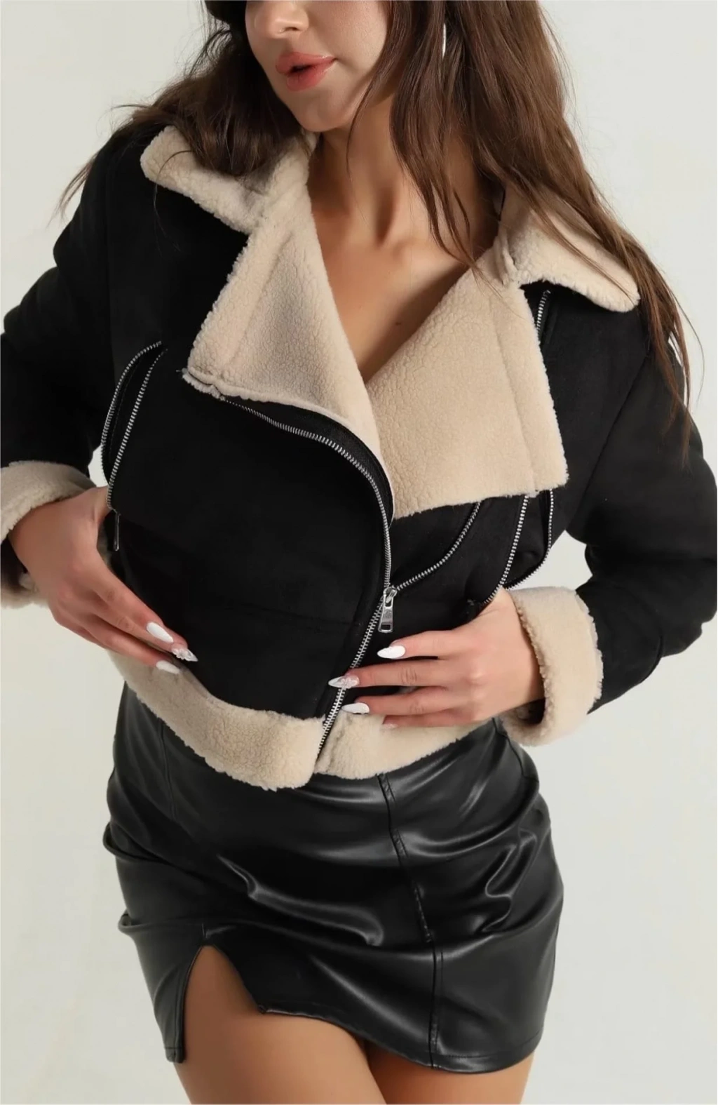 İçi kürklü dışı süet kısa kaban, şıklık ve konforu bir arada sunuyor. Klasik siyah rengi ile her kombinasyona uyum sağlayan bu kaban, soğuk havalarda sizi sıcacık tutacak.