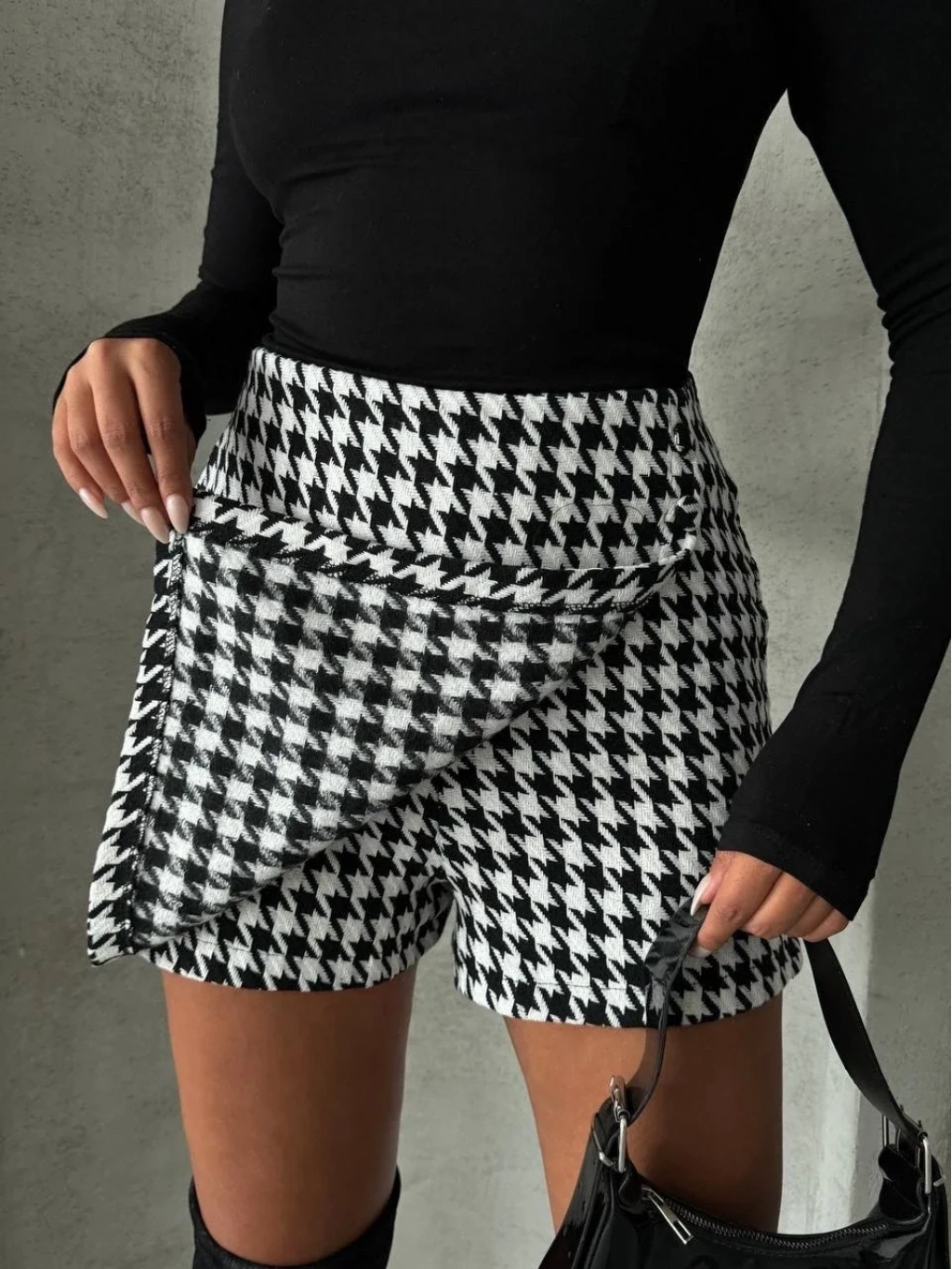 Bu sezonun trend parçalarından biri olan iki düğmeli kaz ayağı desenli CH kumaş şort etek siyahbeyaz renk seçeneğiyle gardırobunuza şıklık katacak. Ürün, rahat ve şık tasarımıyla dikkat çekiyor.