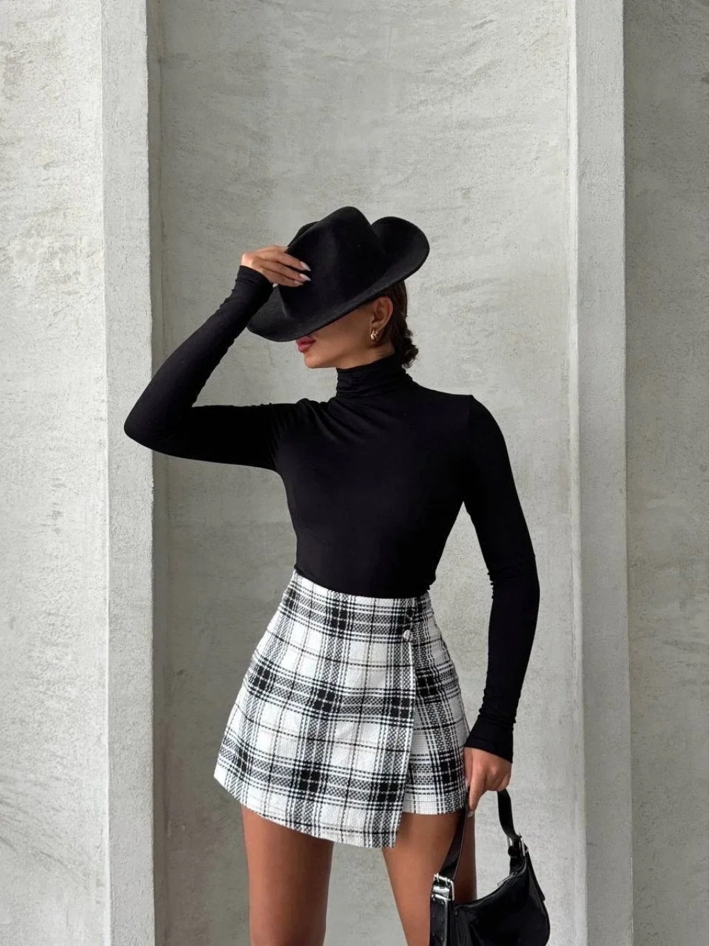 İki düğmeli şort etek ekoseli siyahbeyaz h26414, kadın giyim kategorisinde şıklık ve rahatlık arayanların tercihi olacak bir parçadır.