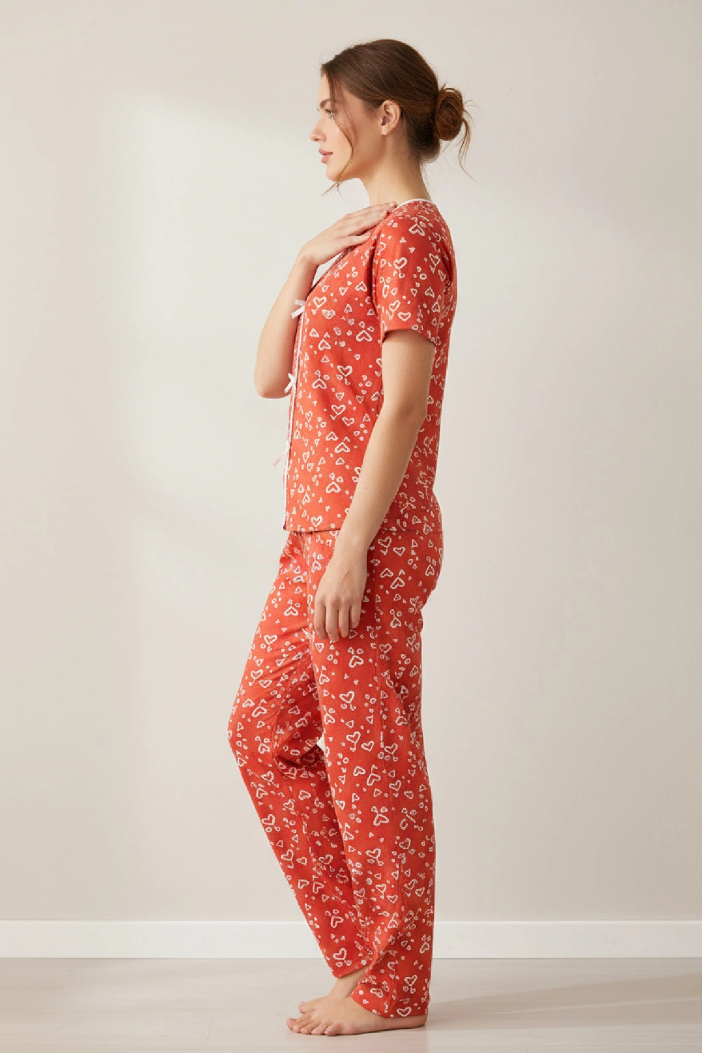 • Canlı ve enerjik tarzıyla dikkat çeken Kadın Turuncu Kalp Desenli Fiyonklu Kısa Kollu Uzun Pijama Takımı, evde geçirdiğiniz her ana pozitif enerji katıyor.
