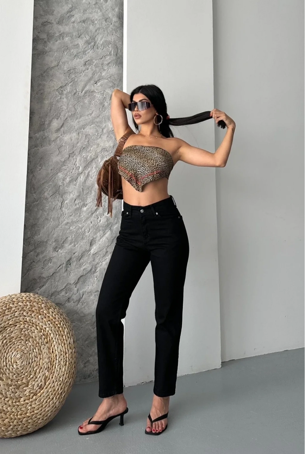 Yüksek bel tasarımı ve geniş paça detayıyla şıklığı ve rahatlığı bir arada sunan Mom Fit Enzim Taş Yıkama Jeans Pantolon Siyah D2006, gardırobunuzun vazgeçilmezi olmaya aday.