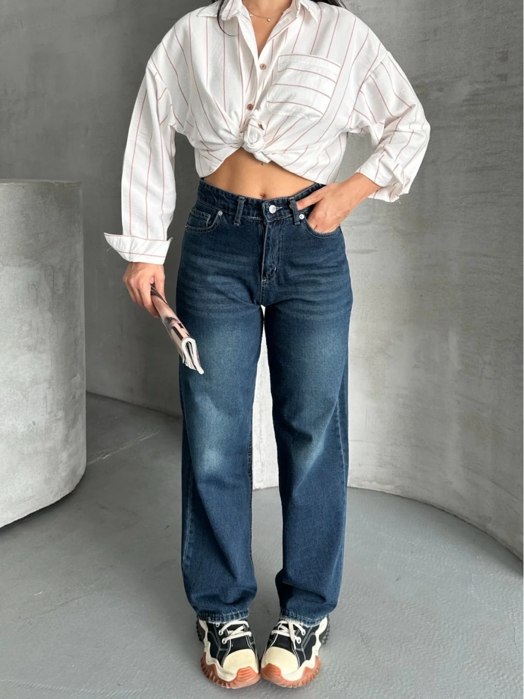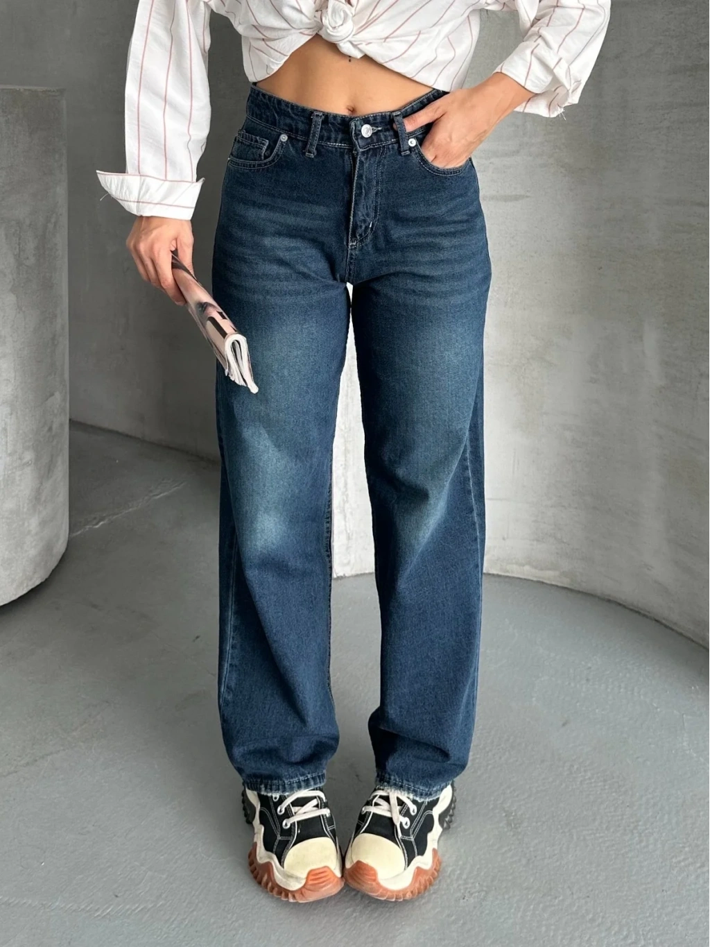 Palazzo bıyık enzim yıkama jeans pantolon koyu mavi d2008, şıklığı ve konforu bir arada sunar.