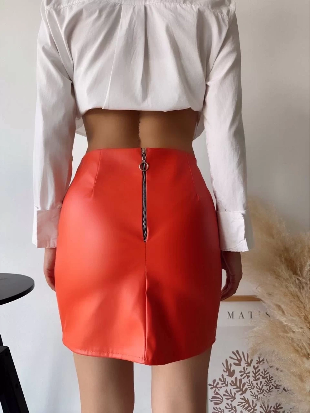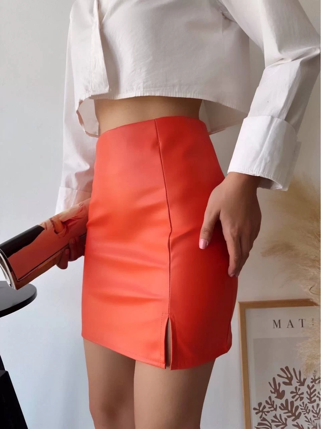 Yeni sezonun trend parçalarından olan turuncu deri etek, gardırobunuza enerjik bir dokunuş yapacak!