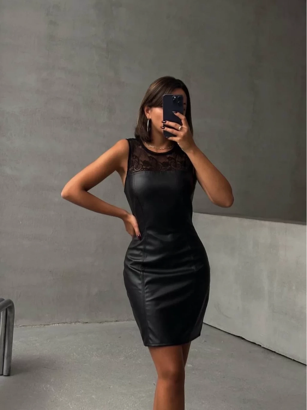 Üstü dantelli straplez deri elbise, şıklığı ve feminenliği bir arada sunuyor.